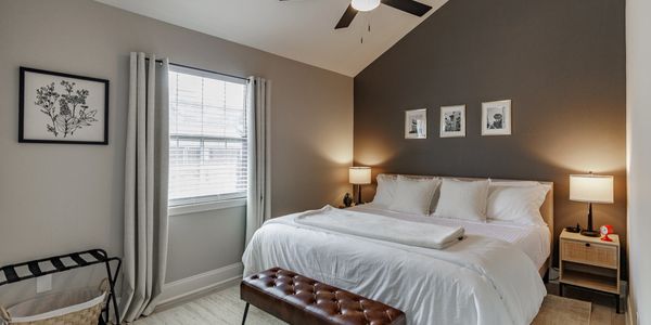 Each bedroom offers a restful retreat with a king-sized bed, nightstands, and soft bedside lighting. You'll also find a ceiling fan, full-length mirror, convenient USB outlets for easy device charging, and ample storage with hanging space and drawers to keep your stay comfortable and organized. In select rooms, you will find a desk and an ironing board as well.